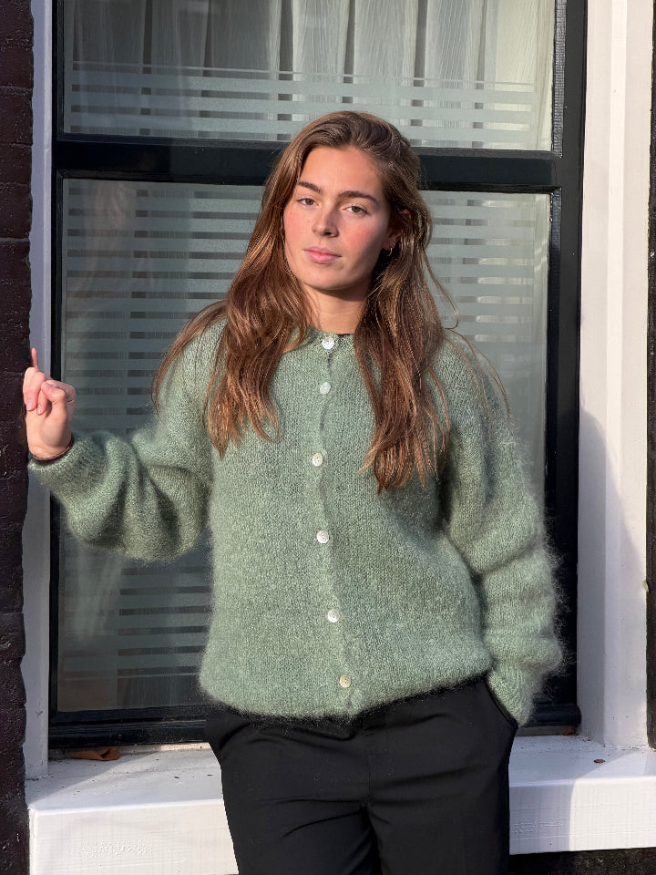 Gebreid, superzacht groen mohair vest met knopen.