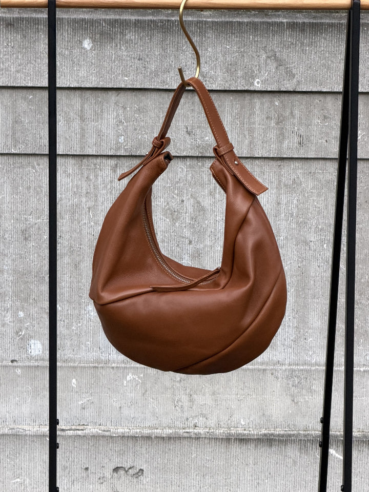 Lambskin leather camel half moon bag. Bag is lined and closes with a zipper.
