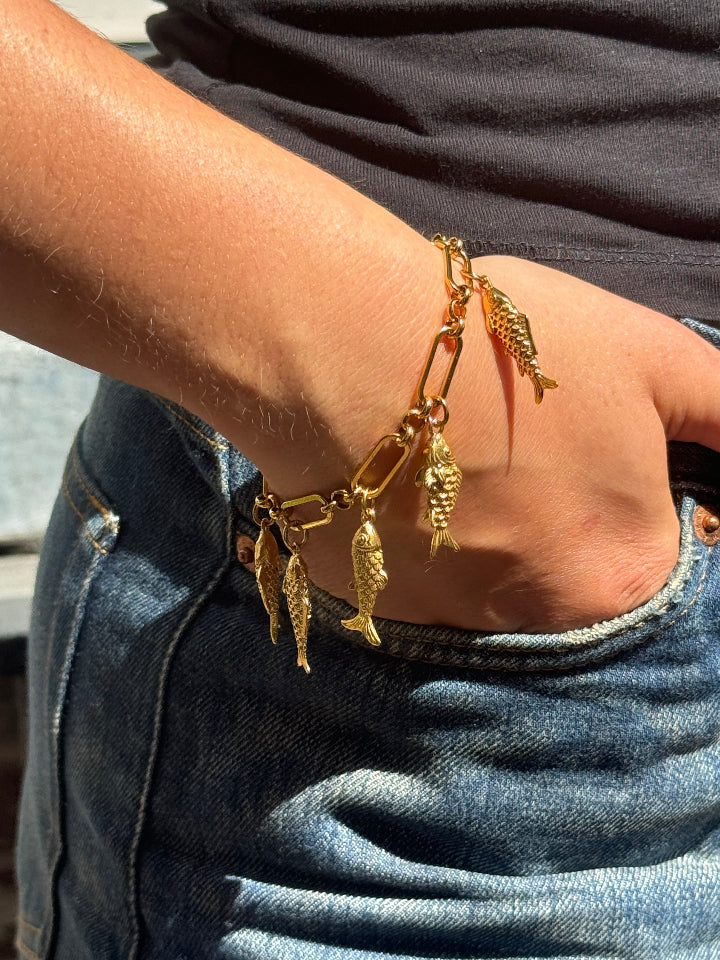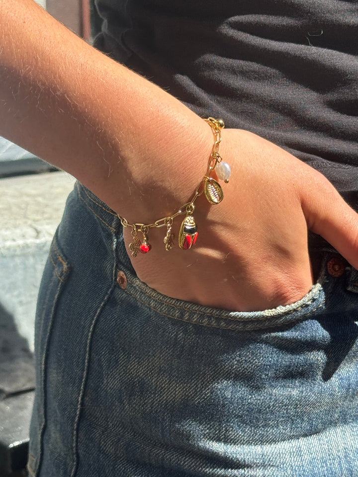 gouden schakelarmbandje met bedels, waaronder een lieveheersbeestje