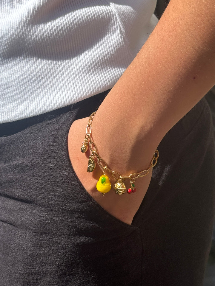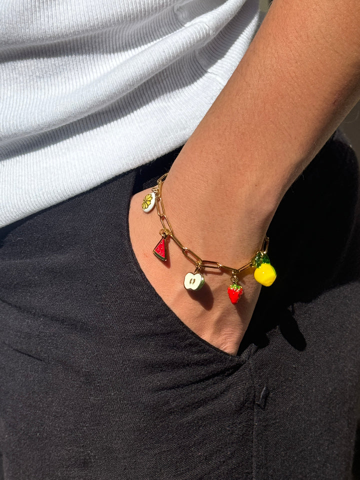 roestvrij staal schakelarmbandje met fruit bedeltjes