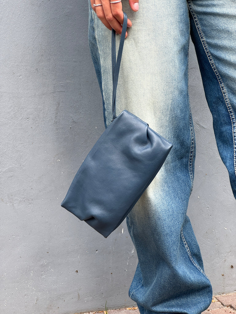 Lambskin leather zip bag with short strap. Bag is lined and has options to store cards etc.
