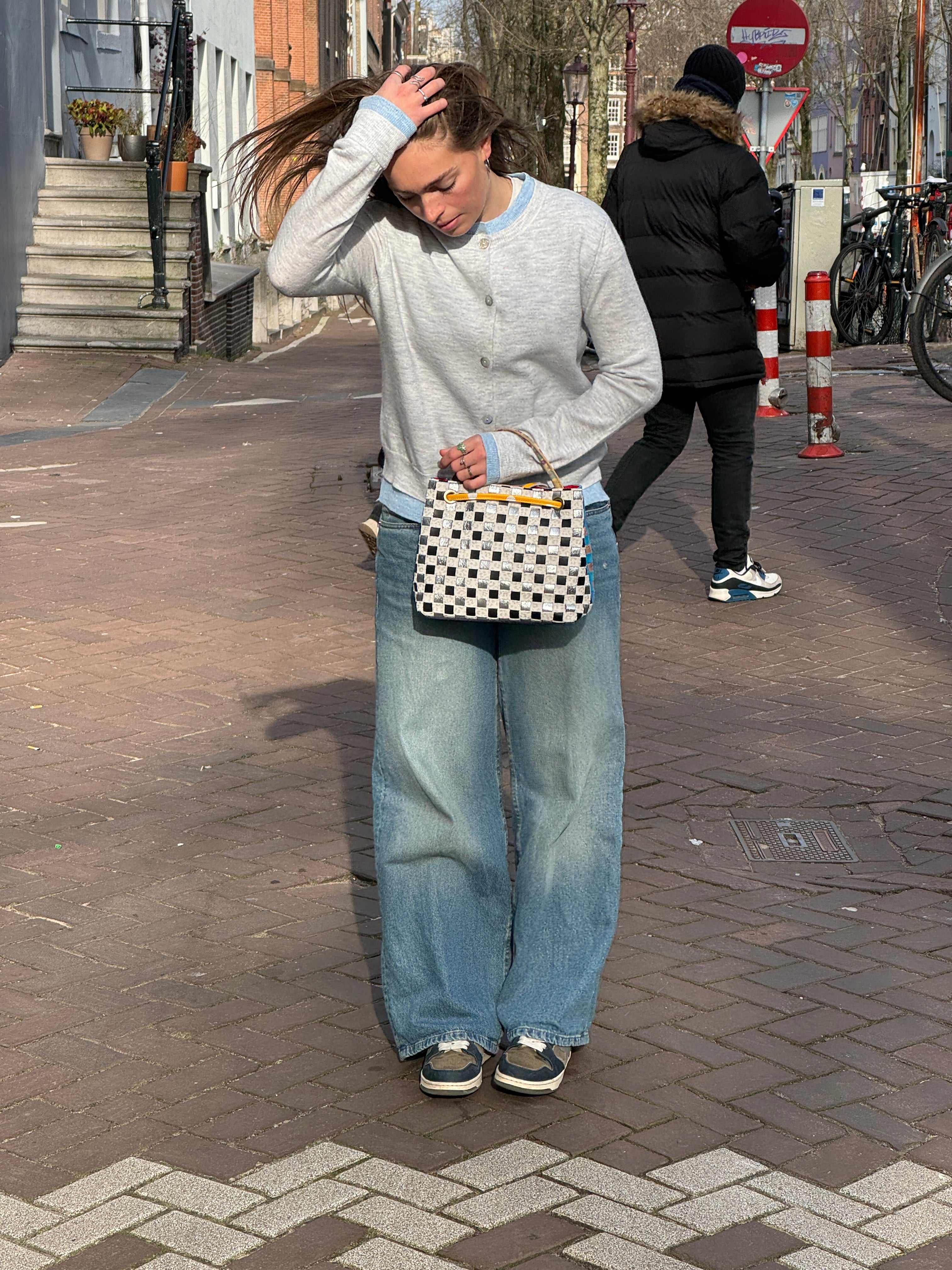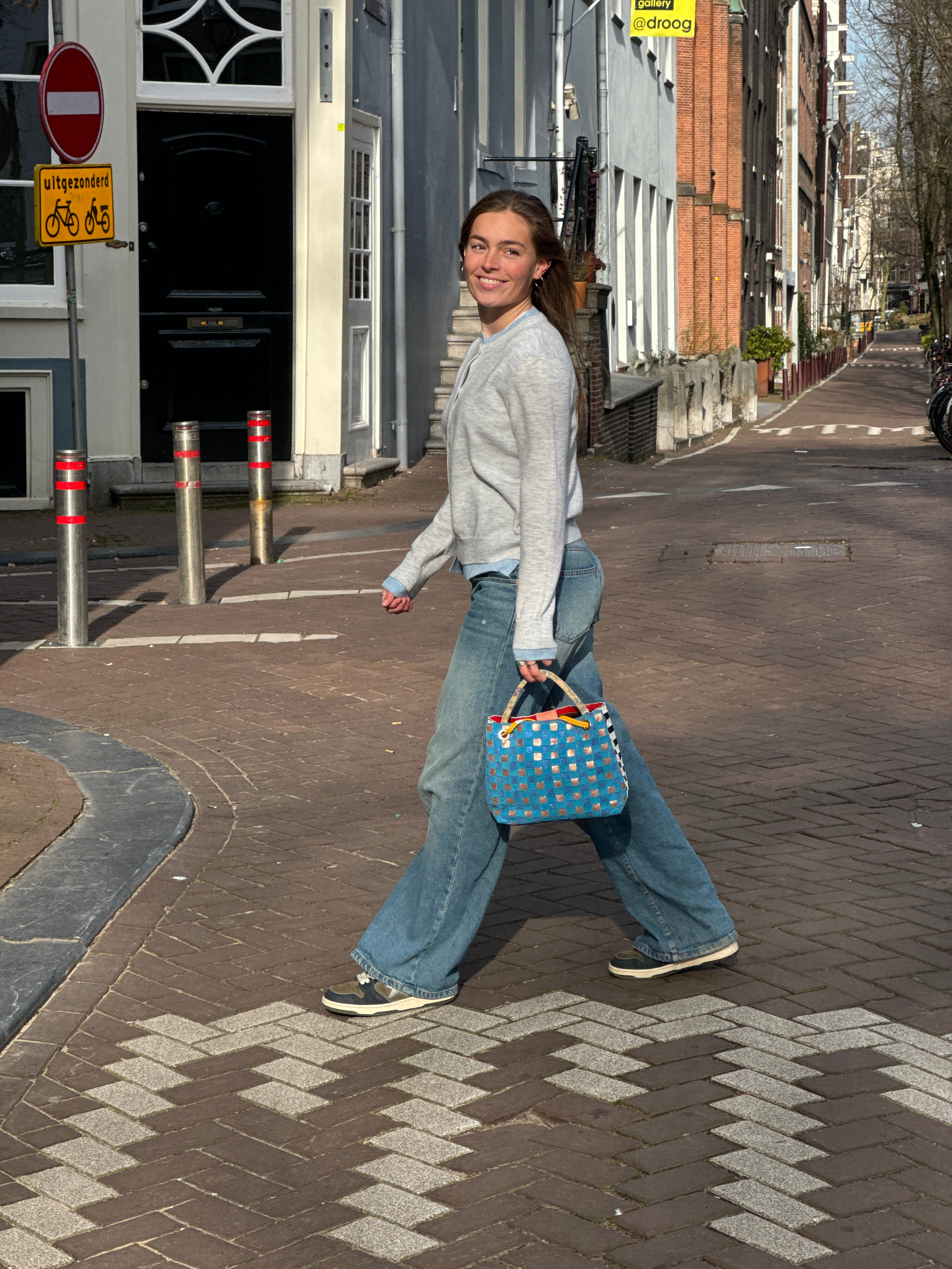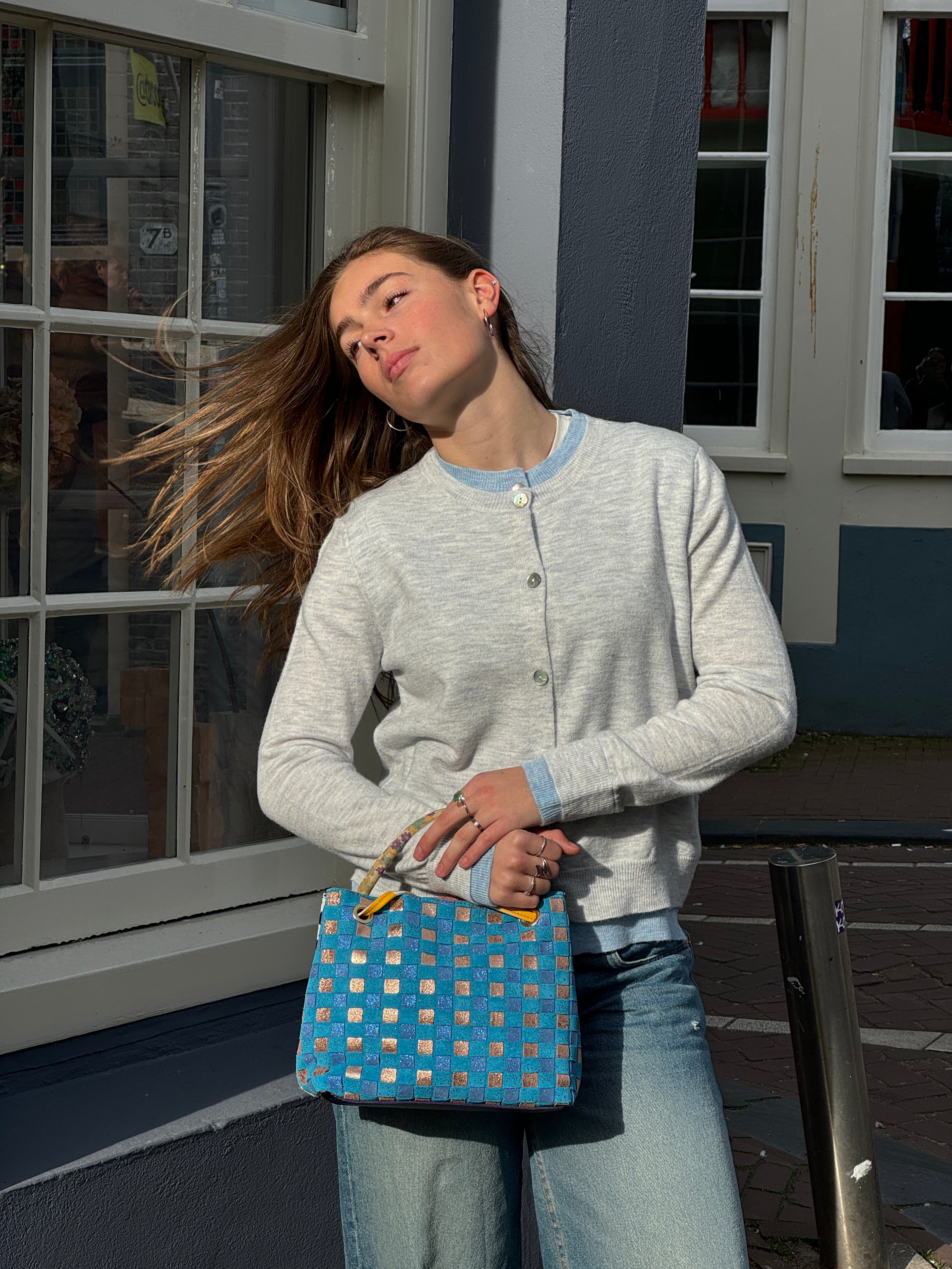 Unieke leren schoudertas met zowel voor als achter geweven leer. Een kant is zwart, zilver wit en een kant is blauw geweven leer. Tas sluit met een drukker. De tas heeft een binnenzak met rits.