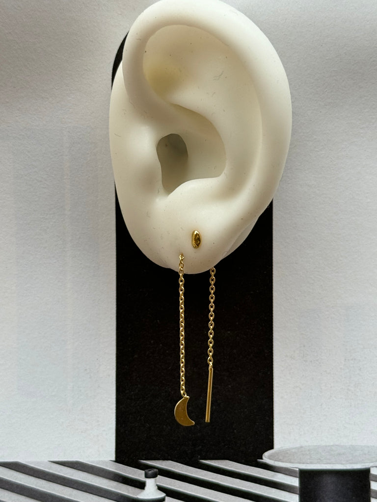 Zilver vergulde doortrek (threader) oorbel, maan.