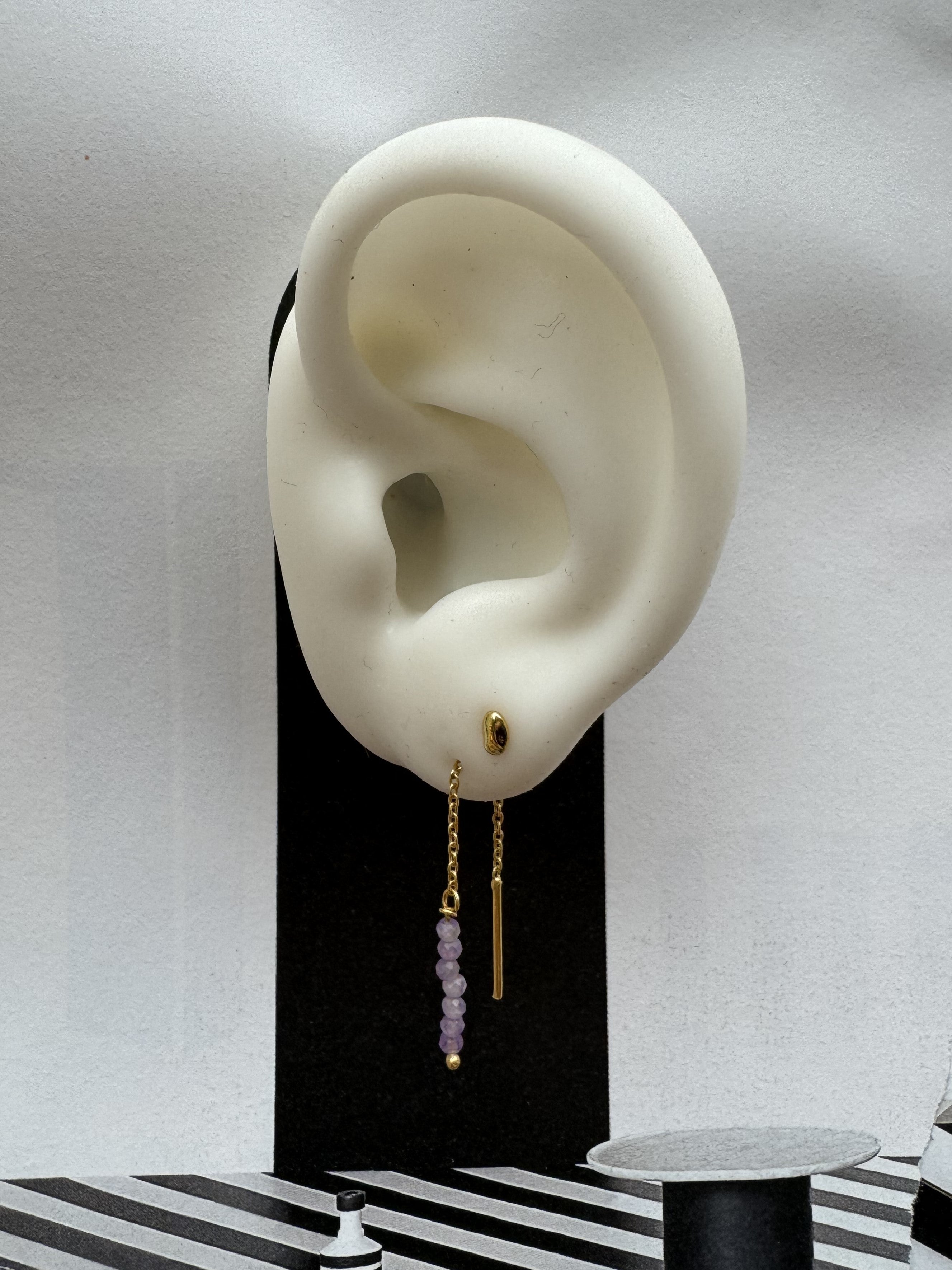 Zilver vergulde doortrek (threader) oorbel, paarse edelsteentjes.