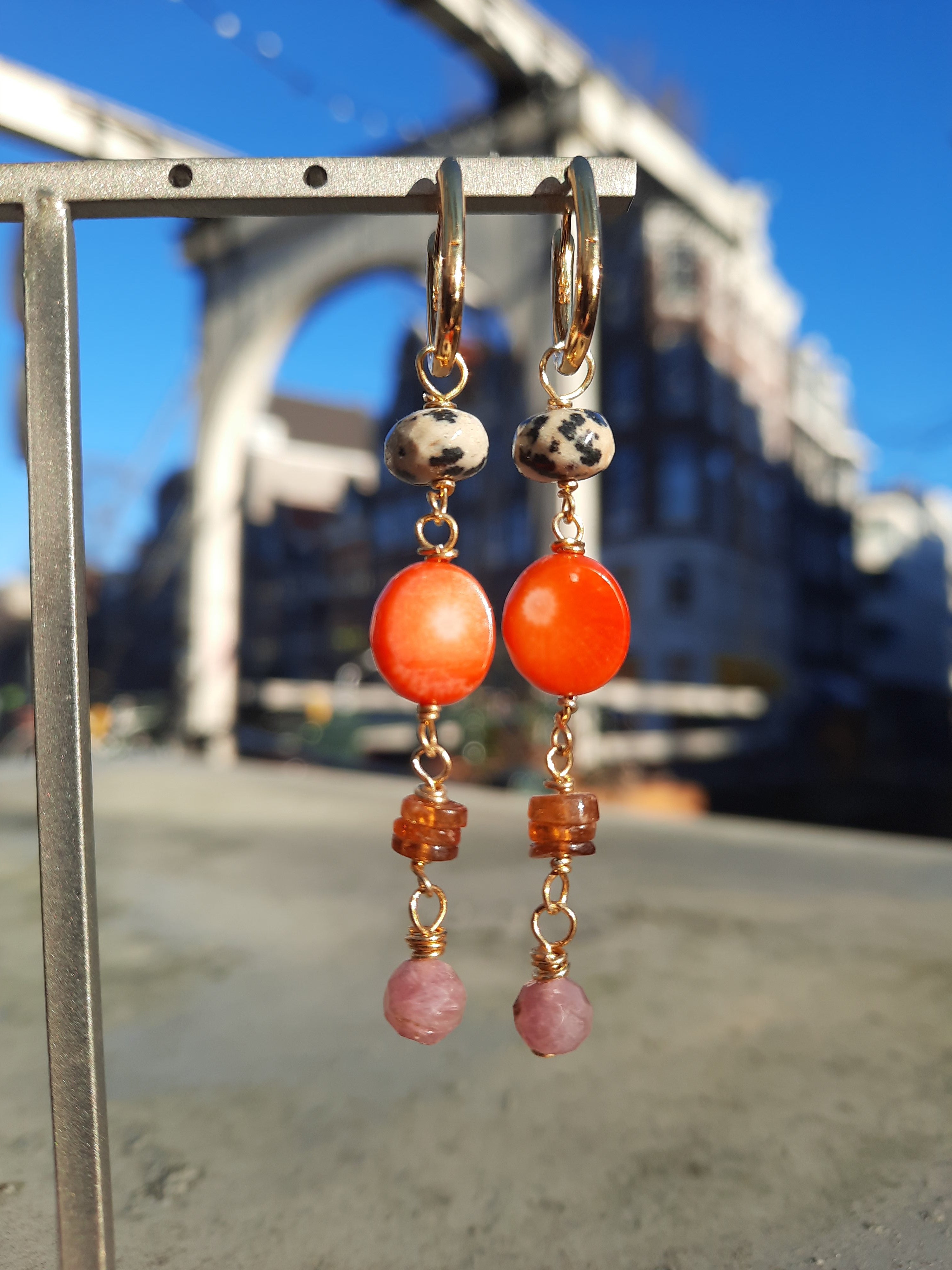 Zilver vergulde oorbellen met half edelsteen hangers (dalmatier jaspis / bamboe koraal / hessoniet / agaath).